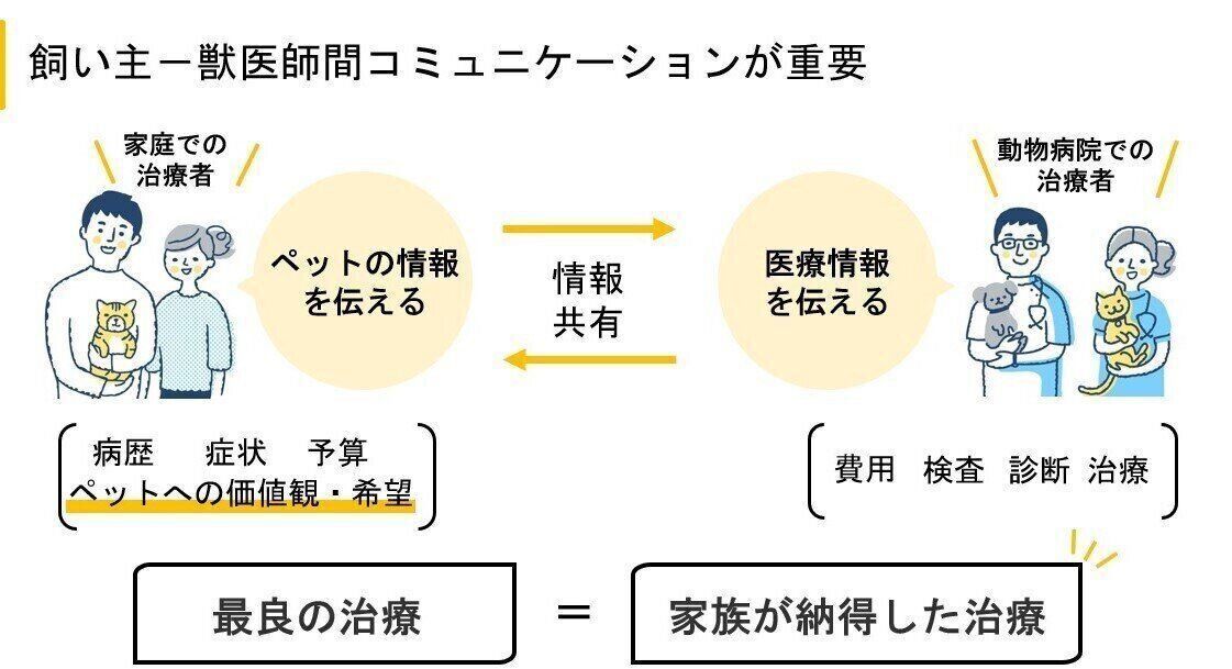 このどちらを選択するかの答えの正解はなく、飼い主さんがどの治療方針が納得できるかによって変わる。このように実際の診察場面でも、獣医師と飼い主のコミュニケーションが重要になる場面は多い。ペットと悔いの少ないお別れをするためにも、獣医師と積極的に意思疎通をすることが勧められる。
