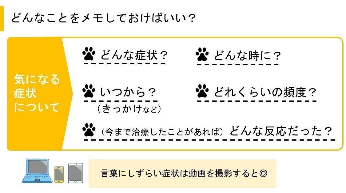 場合によっては、飼い主さんがこれは病気と関係ないのではと考えることに原因が含まれていることや、家族の状況や仕事の都合なども治療をしていく上で重要になることがある。まずは、何でもいいので気になることや思い当たることを書いてみるのがよい。そして、もし可能なら整理し、箇条書きでまとめる等することで、読む側の獣医師の負担も減る。