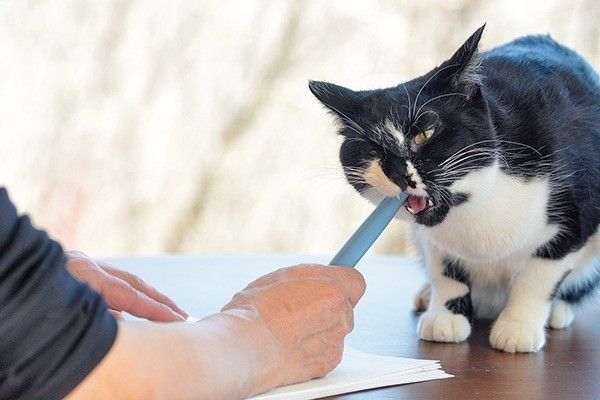 猫は獲物の動きに刺激されます。人が文字を書くときの動きが、猫にとっては獲物の挙動のように思えるため、反射的に噛み付いてしまうのです。猫の狩猟本能ならではですね。