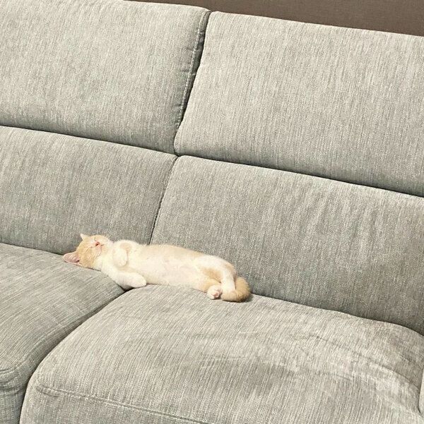 とある日、ソファで丸まって寝ていたというみーちゃんですが、飼い主さんが少し目を離すと、写真のように仰向けで寝ていたのだそう。