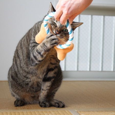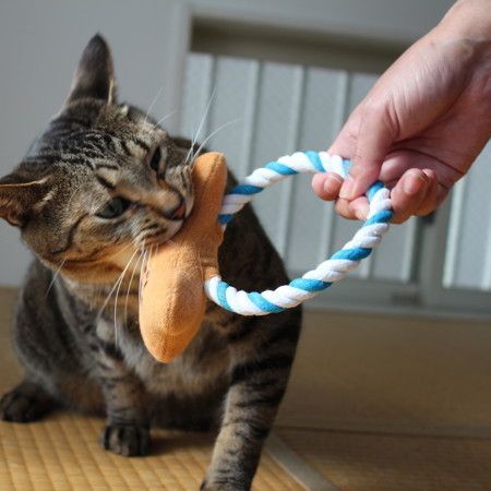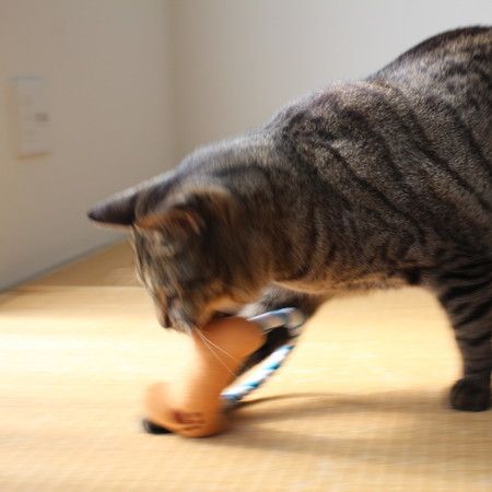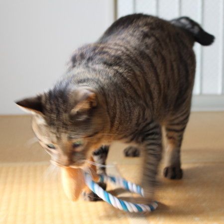 これは予想通りでした。くわえやすい大きさ、鈴付き、しっぽがビヨ〜ンと伸びるところは、まさにうちの猫の好み。狩猟本能がくすぐられるのか、自分の手元に置いて、満足そうな顔!