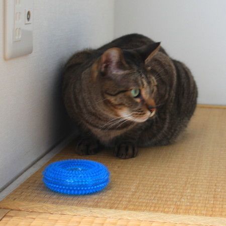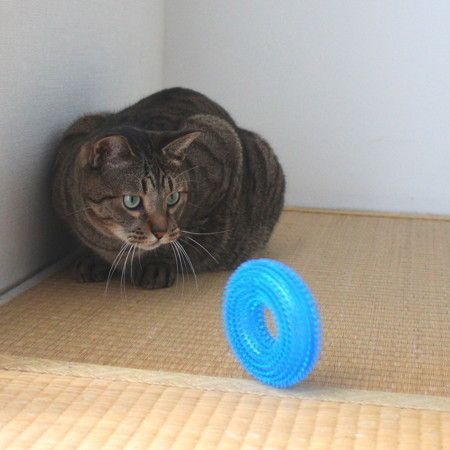 投げたりコロコロと転がしてやると、喜んで追いかけたりパンチをして遊びました。ただ、素材がプラスチックで固いせいか、くわえて自分で遊ぶことはありませんでした。