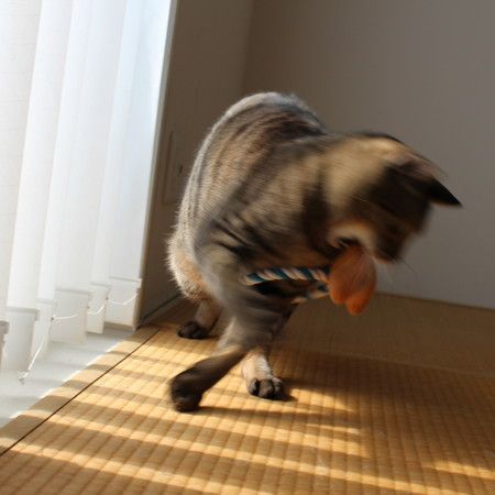 とたん目がキラ〜ンと光り、あっと言う間に持ち去って、一人遊びを始めました。その様子を連続写真でどうぞ!