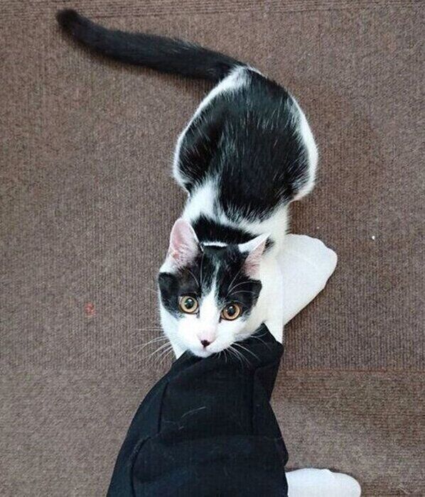 とある日、飼い主さんが仕事に行こうとすると、むすびくんは飼い主さんのことを必死に引き止めてきたのだそう。飼い主さんの足をしっかりとホールドし、「行っちゃだめ」と言わんばかりにじっ…と見つめています。