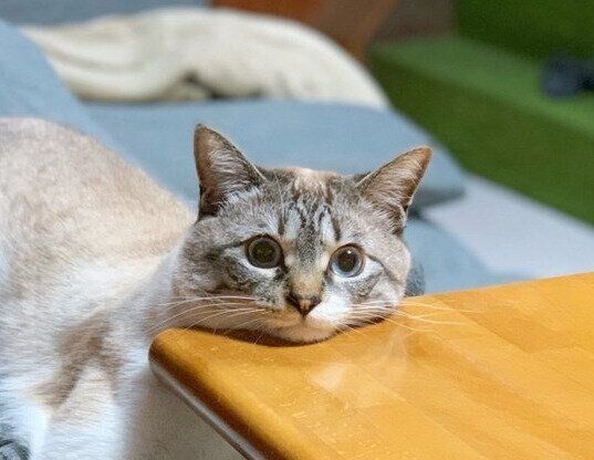 「なんとも不自然に見える姿勢ですが、不思議とこめくんの表情からは、リラックスしている様子が伺えます。“ソファに登っていたら、頭もちょうど置ける場所見つけちゃった”という感じでしょうか」