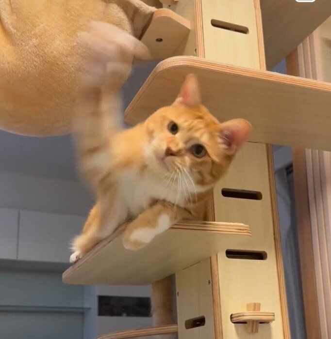 「とらさんはキャットタワーに座って、私が投げる小さなボールを打ち返す遊びが大好きなので、(この遊びを始めると)ボールを投げてもらうのをずっと待っています。