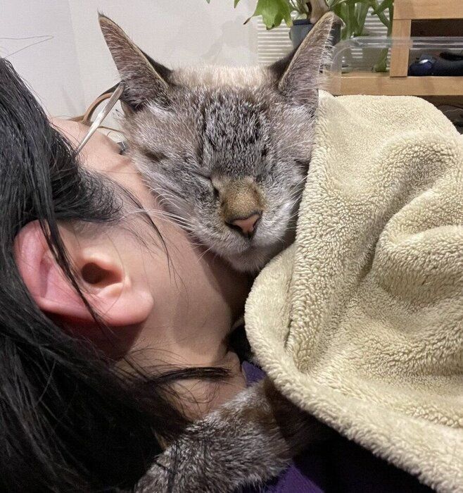 「暑くなって毛布から顔を出したら、目の前に飼い主さんの顔があったのではないでしょうか。信頼している飼い主さんにピッタリフィットし、安心して気持ちよく眠れている様子が読み取れます」