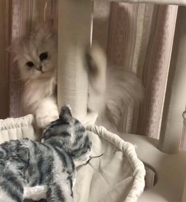 愛猫ピピくん(投稿時1才)のキャットタワーに、猫のぬいぐるみが!大事なテリトリーによそ者が入ってきたと思い必死に戦うピピくん。最後はぬいぐるみを落とし、勝ち誇ったような表情を見せるのでした♡