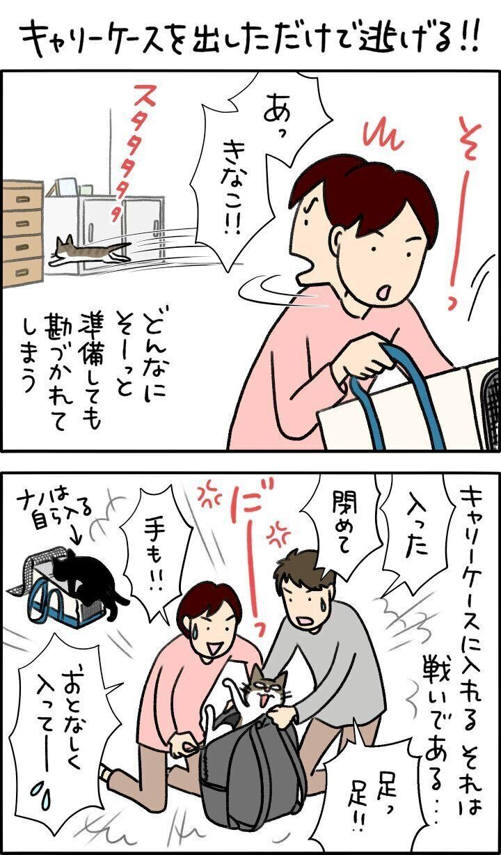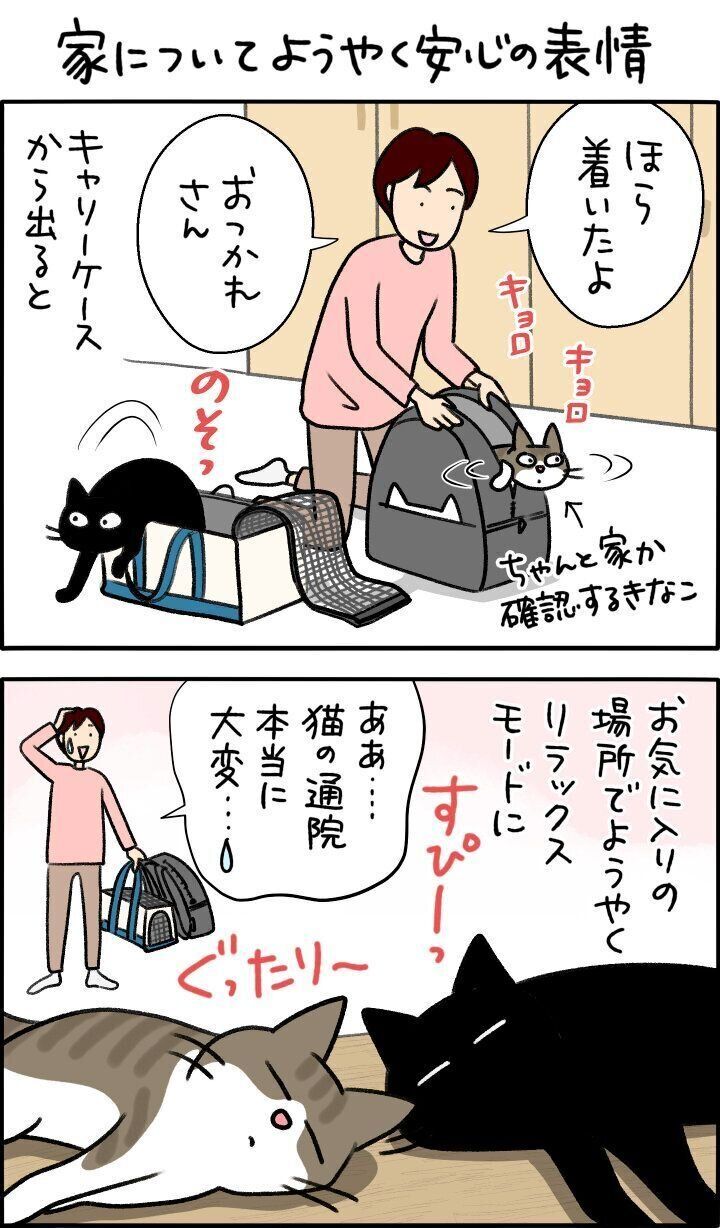 そんな「動物病院苦手ネコちゃん」のリアルを飼い主目線で描いてくれたのが、漫画家のぱるぱーるさんです。愛猫ナノちゃん(10才/メス)ときなこちゃん(9才/メス)との通院奮闘ストーリーをご紹介します。