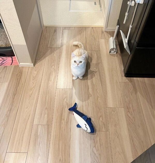 「このとき、ぬいぐるみのサメちゃんを投げて追いかける遊びをしていたのですが、写真を見ての通り目が輝いているので、楽しいのと早く投げてほしい気持ちからあのような表情をしていたのかなと(笑)