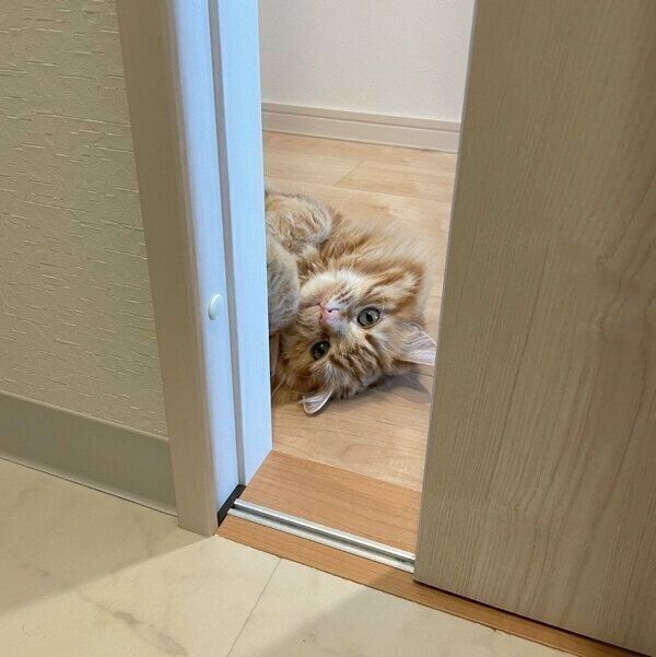 「以前、ちくわはお風呂場に入ってきてシャワーに突撃し、べちゃべちゃになったまま部屋に戻ったことがあったので、いまは“お風呂出禁”にしています(笑) なので、廊下から私のことを見つめていました。