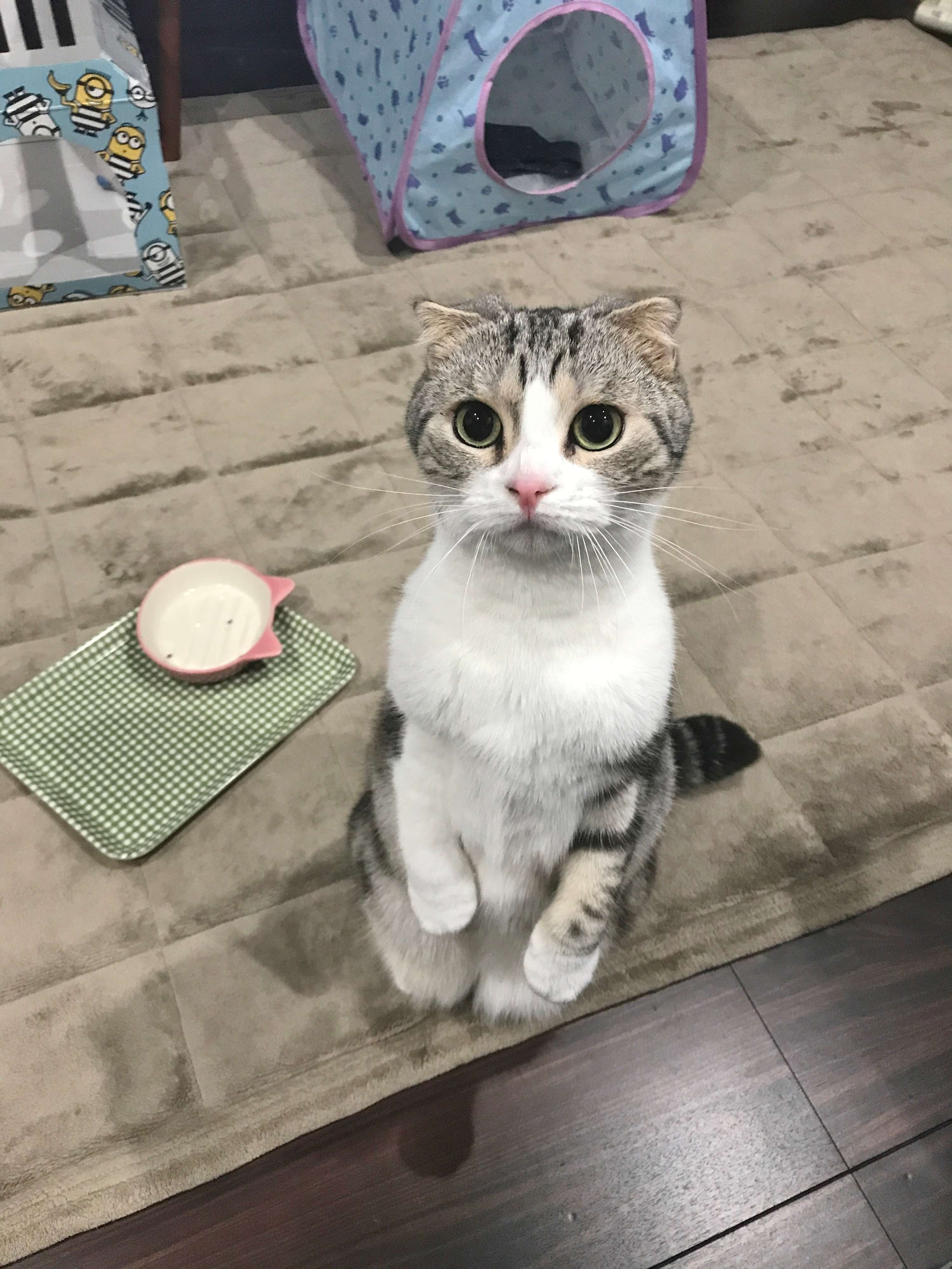 目の前で、覗き見で、立ち上がってなどなど、とにかくあらゆる工夫をして飼い主さんに熱し線を送る作戦です。可愛い瞳でじっと見つめられたら、飼い主さんも「しかたないなあ❤」ってなっちゃいますよね♪