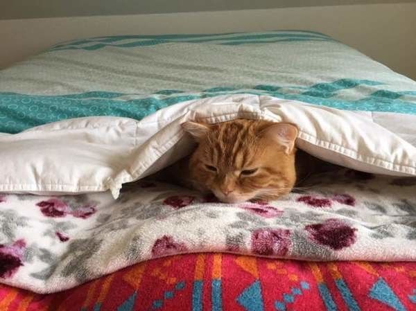 人が寝るようにお布団に包まって眠っているのは、スコティッシュフォールドのレーヴ君。お布団が大好きで、よくママやパパと一緒に眠っているのだとか。お布団から頭だけひょっこりと出している姿に胸キュンです!