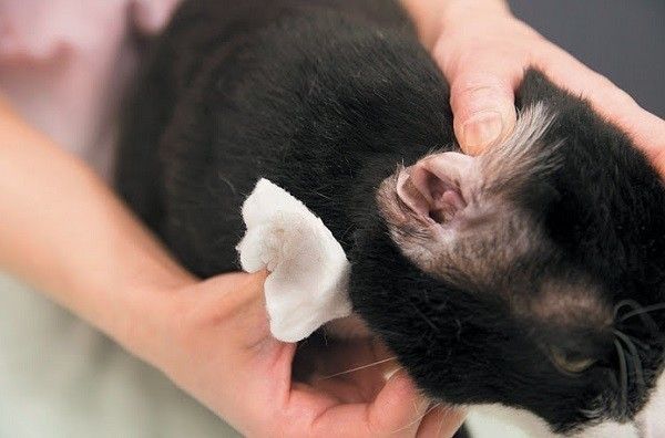 耳アカが目立つ場合は、猫用のイヤークリーナーを使いましょう。ガーゼにイヤークリーナーを付け、親指で耳先を軽く引っ張り、耳の穴を見えやすくします。そして、ガーゼを耳の穴に少し押し入れ、汚れをかき出すように優しく拭き取っていきましょう。