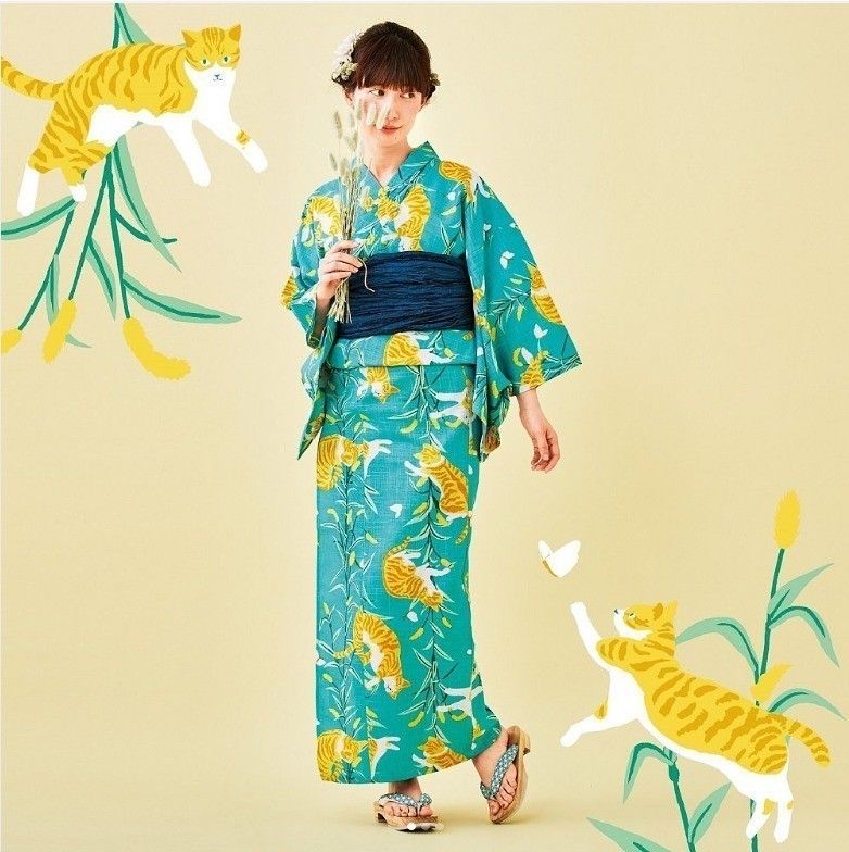 こちらは、鮮やかな「あさぎ色」に、茶トラ色の猫がとても映えている浴衣。浴衣柄では珍しい、猫じゃらしが描かれているのもポイントですね。360度どこからでも猫が見えるデザインは愛らしさいっぱいですが、落ち着いたネイビーの帯を合わせれば、大人びた雰囲気に一変!