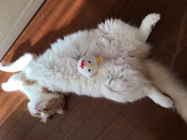 スコティッシュフォールド・ロングヘアの男の子ハルくんは、お友達のピーちゃんをお腹にのせて「ヘソ天」中。ハルくんはこのあと起き上がったのか、はたまたこのまま眠ってしまったのか、後日談がとっても気になる一枚です。