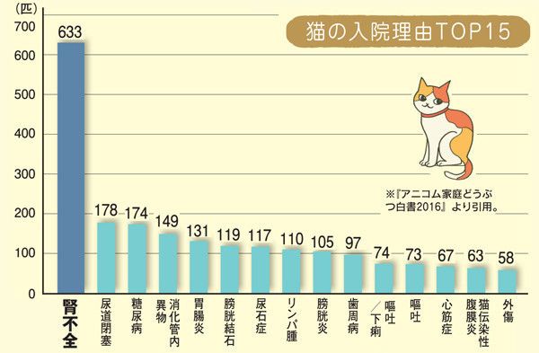 1位は「腎不全」ですね。腎不全が進行すると、脱水症状を改善するために、入院をして常時静脈点滴をすることがあります。