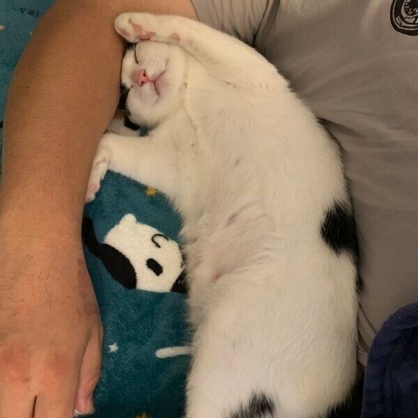 パパさんの腕の中にすっぽりおさまり、完全にリラックスする猫 寝姿からわかる心理は?|獣医師解説