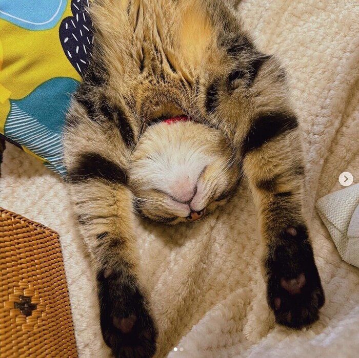 「ヌイヌイは“軟体動物”のようで、普段から寝方のバリエーションが豊富です。この姿を見たときは、『相変わらずおもしろい寝方するなー』と。