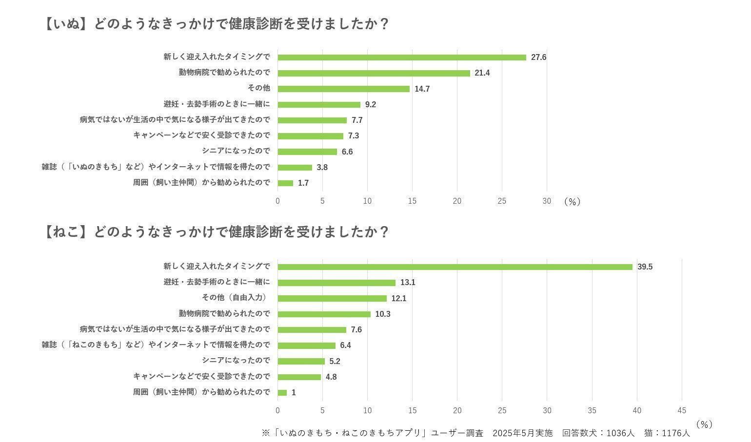 特に犬の場合は「動物病院からのすすめ」や「キャンペーンで安く受診できたので」など、動物病院からの声掛けが健康診断を受けるきっかけとなったという回答が多く、動物病院の方でも健康診断を受けてもらうきっかけづくりに力を入れていることがわかります。