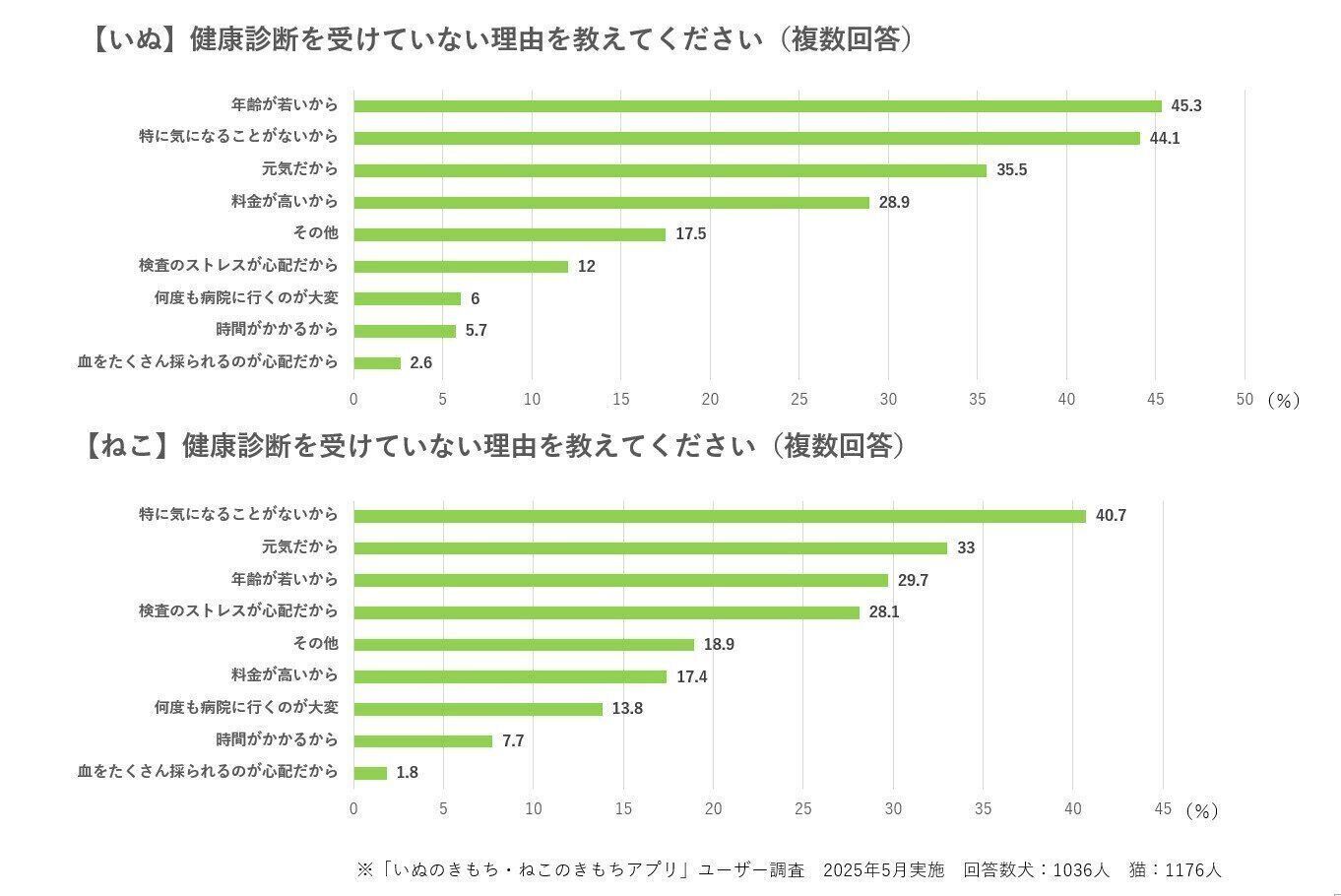 また、猫では「検査のストレスが心配だから」という声もとても多く、やはり猫の性質が大きな壁となっているようです。