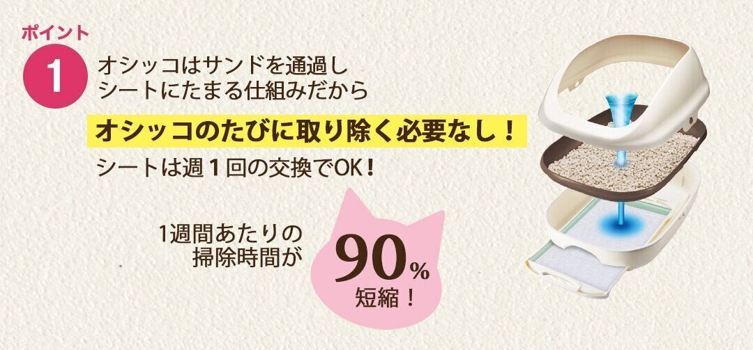 最も魅力を感じているのは、掃除のラクさと圧倒的な消臭力です。 無香料のシートでも十分に消臭効果を発揮してくれます。週に1度、シートや砂を取り替えるだけなので、毎日の掃除の手間が激減しました。
