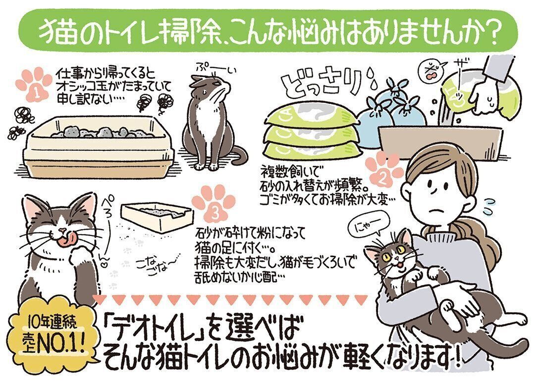 鉱物の猫砂をいくつか変更しながら使用していましたが、掃除の大変さや臭いが気になり、長年猫と暮らしている友人からおすすめされた「デオトイレ」を使いはじめました。