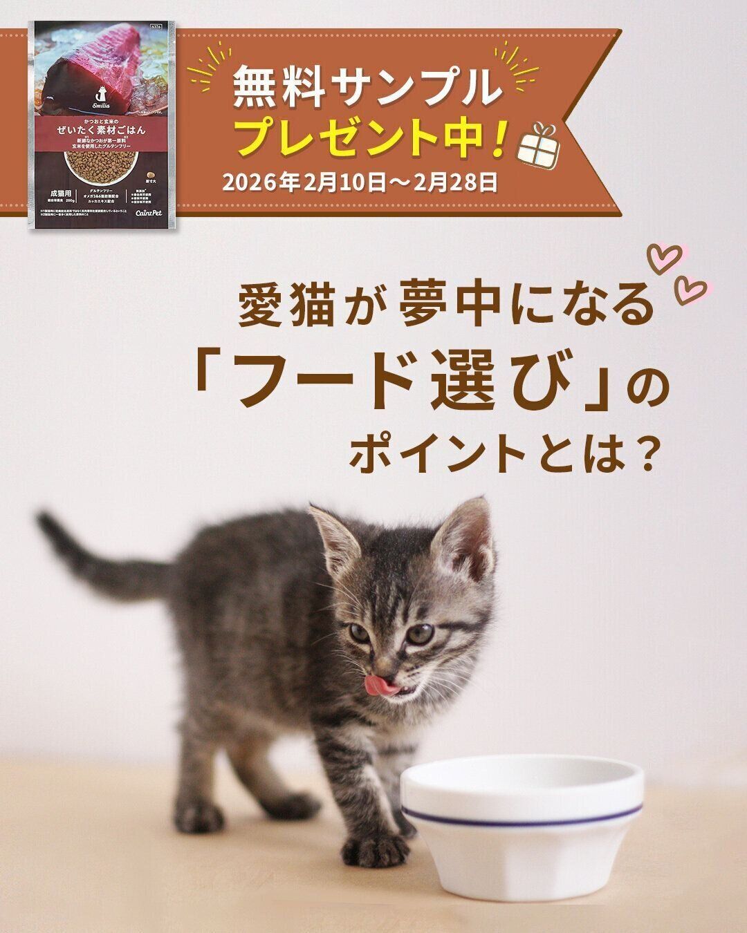 「ぜいたく素材ごはん」の無料サンプルをプレゼント(対象期間:2026年2月10日~2026年2月28日)していますので、ぜひ愛猫にも試してみてくださいね!