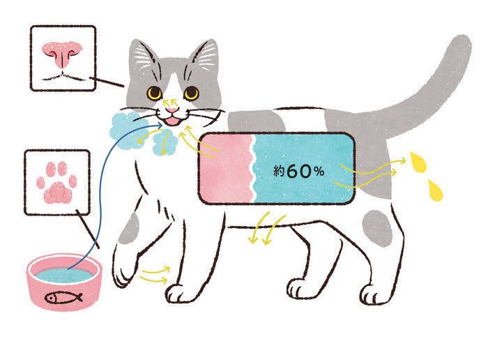 猫のカラダは、子猫で80〜90%、成猫で60〜70%が水分です。大人になってからは人間とほぼ同じですが、子どもの頃は猫のほうが水分の割合が大きいんですね。