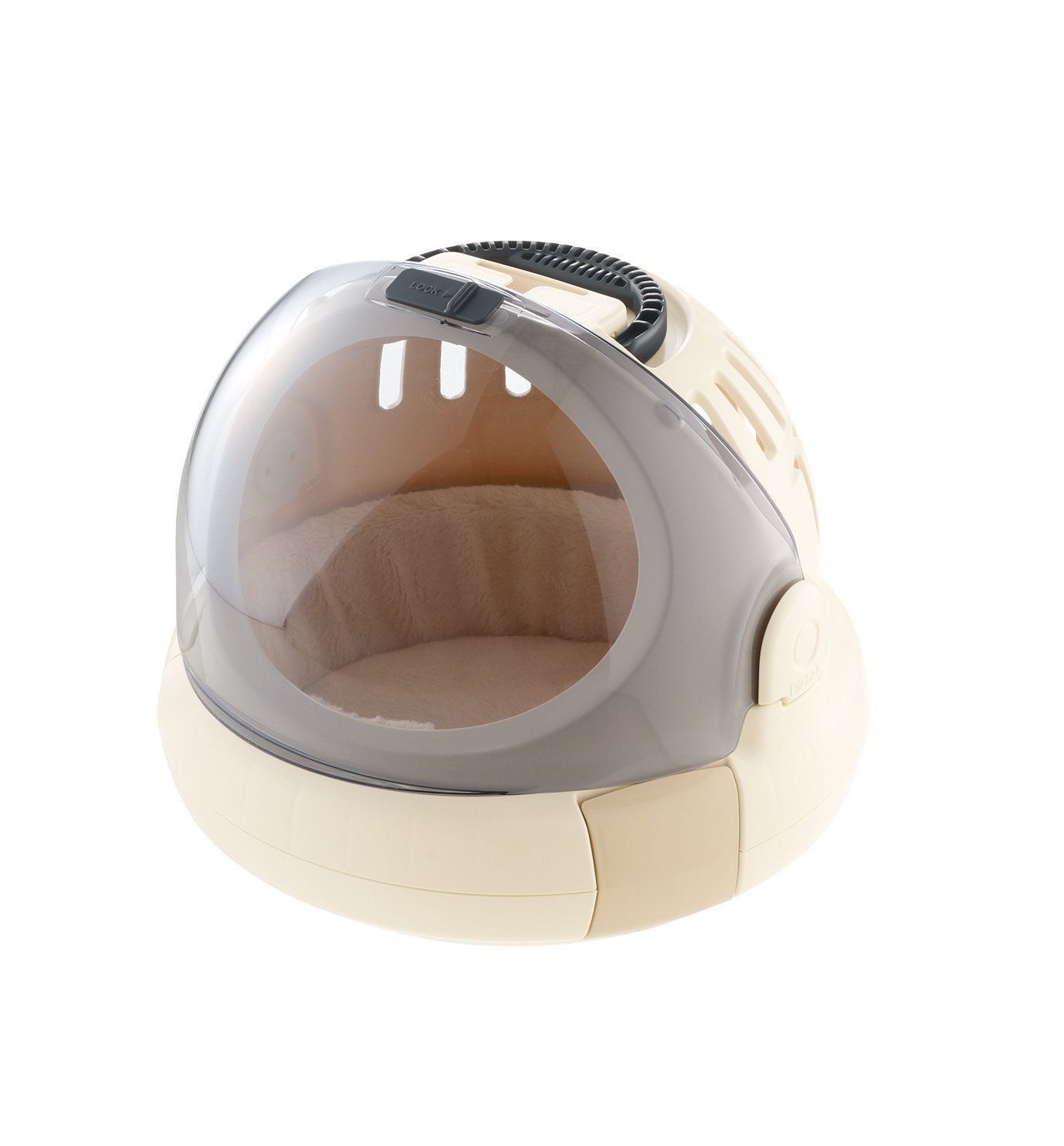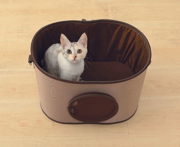 キャリーケースにもなる、ラウンド型の猫ベッド。猫が好きな丸い形と柔らか素材のクッション付きで、おうちではベッドとして使えます。フードをスライドさせて閉めれば、ハンドル付きのキャリーケースに早変わり。分解してお手入れできるので、衛生的に使えるのもうれしい。