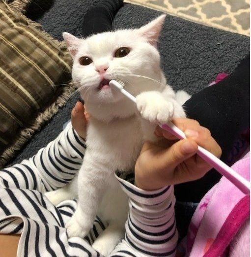 - 猫の口元に持って行き、自由に噛ませます。歯ブラシを動かしてなるべく奥の歯で噛ませましょう。