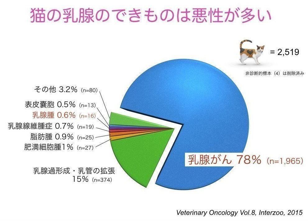 でも猫の場合は下のグラフの通り、ほとんどが“乳腺がん(乳がん)”です。80%というのは、とても高く怖い数字ですよね。