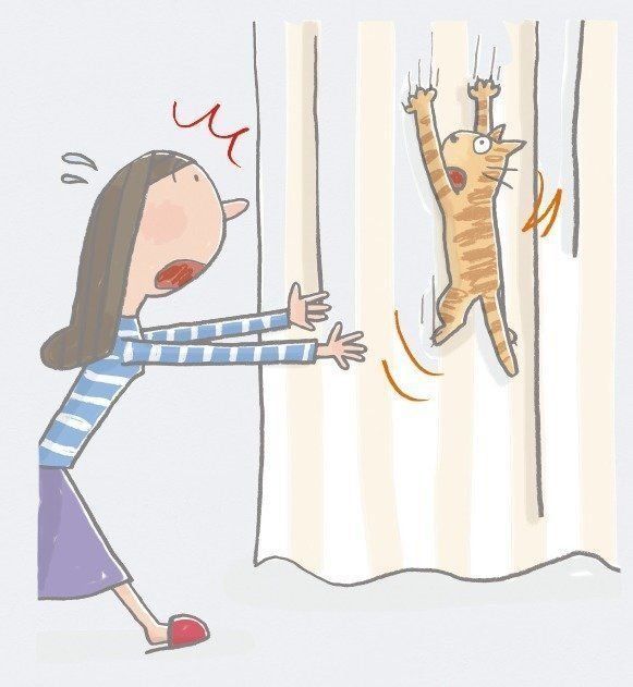 爪が伸びたまま猫がカーテンなどに飛び付くと、爪が引っかかり、折れたり剥がれたりして出血することが。また、カーテンに宙吊りになると、暴れて足を脱臼するケースも。